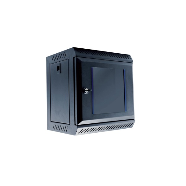 Caractéristiques techniques :  – Porte en verre de sécurité teintée fumée noir fixé sur un cadre métallique – Porte verrouillable et réversible, ouverture à droite ou à gauche avec angle de 180° – Panneaux latéraux amovibles et verrouillables à fixation rapide avec verrou coulissants – Degré de Protection : IP20 – Couleur : Noir givré…